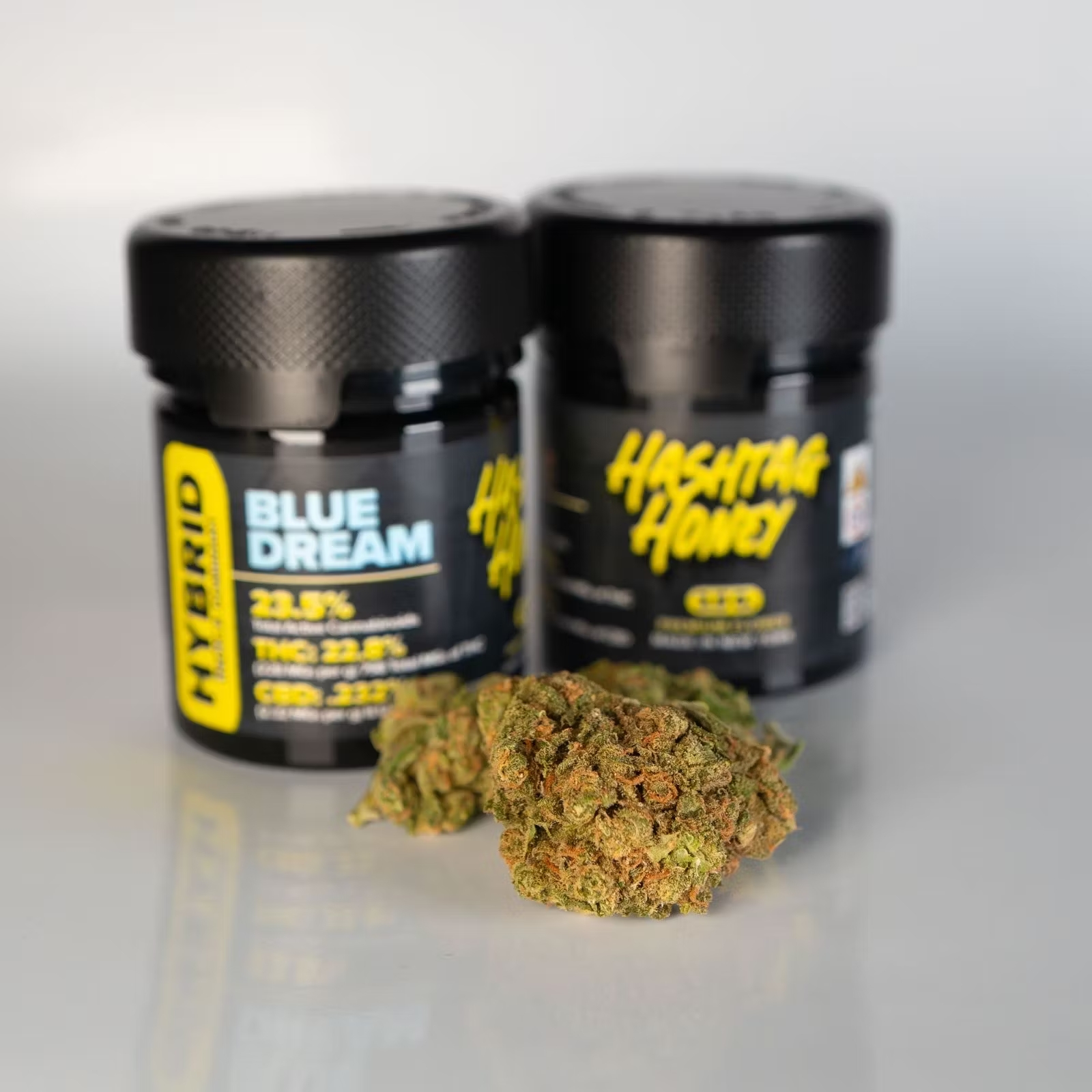 Blue Dream is a slightly sativa dominant hybrid (60% sativa/40% indica) strain that is a potent cross between the hugely popular BlueberryX Haze strains. Users describe the Blue Dream high as having an immediate onset of an uplifting cerebral head high that leaves you completely motivated and focused with waves of creative energy that hit quickly and hard. This is accompanied by a mellow relaxing body high that leaves you warmed, numb, and completely pain free. Due to these potent combination effects, Blue Dream is said to be an ideal strain for treating patients suffering from conditions such as chronic stress, chronic pain due to injury or illness, mild to moderate cases of depression, and sleep disorders, including insomnia. Blue Dream has a delicious aroma of sweet blueberry pie and a taste of sugary sweet blueberries that stays on your tongue long after smoking. This bud has large dense yet fluffy popcorn-shaped bright neon green nugs with amber and blue hairs and rich blue undertones. These nugs are dusted with a fine layer of sandy milky white trichomes and sweet sticky resin.