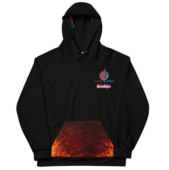 Crafted in a sleek all-black premium hoodie, the design features a powerful flame emblem on the front with “Matawama Brooklyn” branding, symbolizing strength, passion, and purpose. The front pocket highlights a vivid blue-fire effect, representing the unstoppable energy behind chasing your dreams.