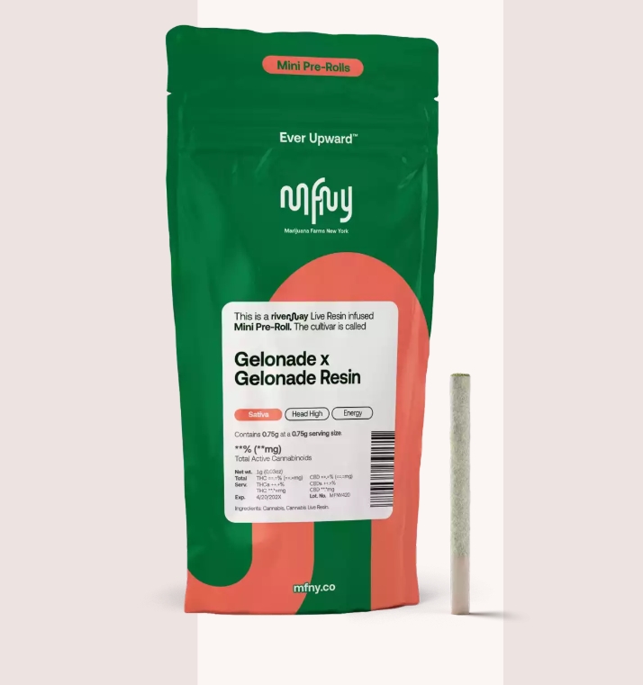 For our resin infused pre-rolls (four-packs), we start with premium, hand-trimmed whole Gelonade flower then infuse it with our in-house made Gelonade live resin HTFSE (High Terpene Full Spectrum Extract from fresh frozen buds) totaling three quarters of a gram in weight. This process creates a higher potency, flavorful product, as Gelonade recalls flavors of the enchanced, sweet citrus, pine, and vanilla. Potent and high in THC, this product is a treat for experienced cannabis consumers. No shake, no trim. Just the very best of our craft cannabis, ready to enjoy. Exclusively single-sourced at MFNY in the Hudson Valley