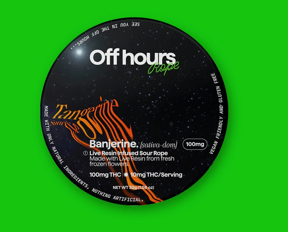 Off Hours brings citrusy elevation with their Banjerine Sour Rope, a live resin–infused edible packed with bold flavor and bright effects. Made with a sativa-leaning hybrid (Banjo x Cotton Candy), this 100mg rope delivers ten 10mg sections of sour yuzu and tangerine zest layered with pineapple sweetness. The live resin infusion offers a full-spectrum kick that fuels creativity, focus, and social energy—without the heaviness. Ideal for breezy day adventures in Dyker Heights, Brooklyn or sunny afternoon hangs in South Beach, Staten Island.