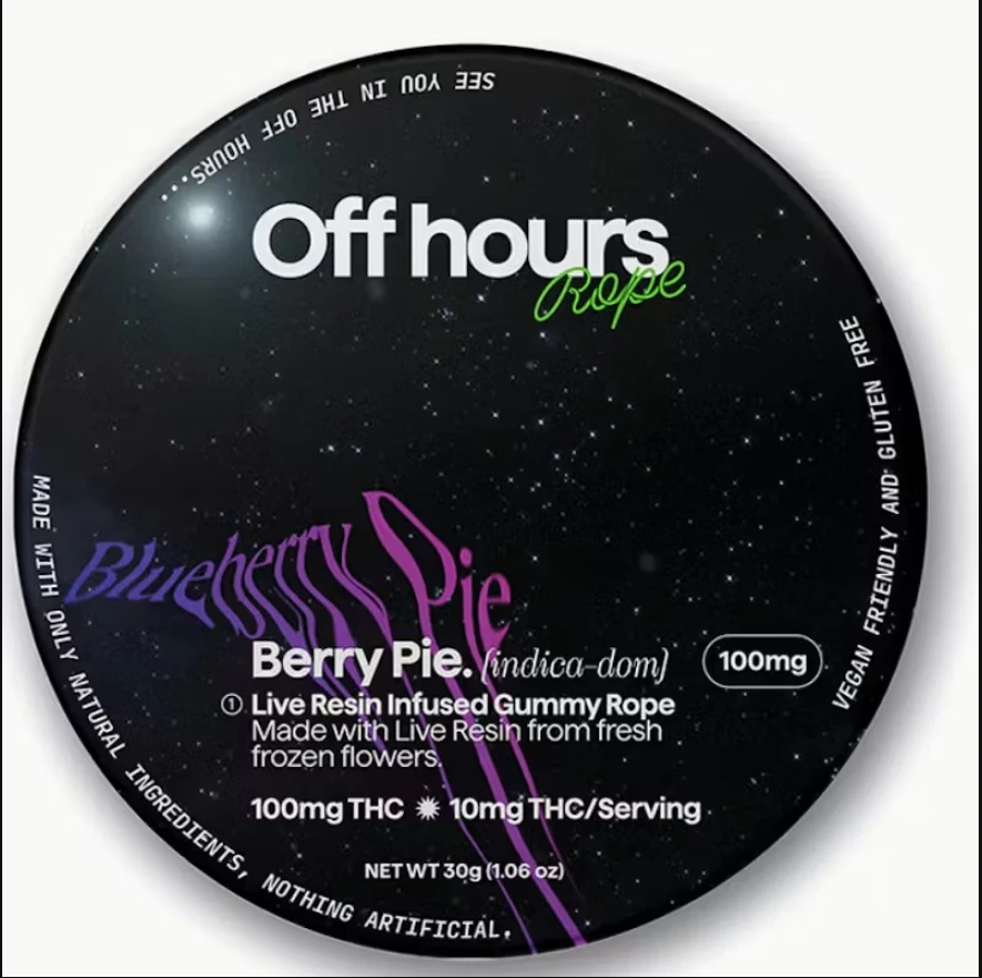 Off Hours Blueberry Pie ropes are infused with Berry Pie Live Resin for a cerebral, relaxing high. Each rope is naturally flavored with blueberry and bakeshop notes to complement earthy, berry Huckleberry Pie. Flavor: Blueberry Pie Size: 1ct Strength: 100mg THC (10mg/serving) Species/Type: Indica-dominant hybrid Lineage: Berry Pie x Cotton Candy Effect: Cerebral, Body Relaxation Pairs well with: Unwinding at home, Reading a book Suggested use: Start with 1/2 of a section. Wait 1 full hour before increasing dose. Ingredients: organic cane sugar, reverse osmosis water, organic tapioca syrup, organic fruit juice from concentrate, fruit pectin, organic fruit flavoring, natural food coloring, MCT oil, cannabis extract, soy extract, terpenes