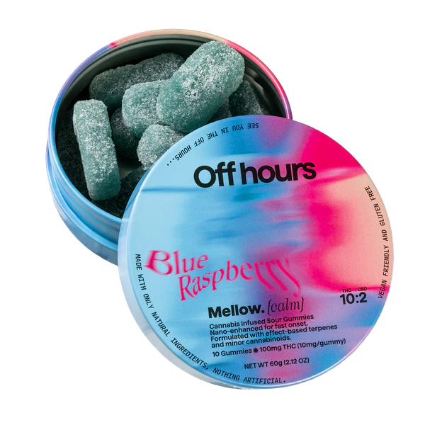 Flavor: blue razzberry (sour)|Terpenes: special blend for calm|Size: 10ct|Strength: 100mg THC (10mg/serving) + 20mg CBD (2mg/serving) + 20mg CBN (2mg/serving)|Our blue razzberry flavored gummies are formulated with a unique combination of THC CBD and CBN to give you the perfect chilled out high. Nano-enhanced cannabinoids for fast onset. Vegan friendly and gluten free.|Suggested use: start with 1/2 of a gummy. Wait 1 full hour before increasing dose.|Ingredients: organic cane sugar reverse osmosis water organic tapioca syrup organic fruit juice from concentrate fruit pec3n organic fruit flavoring natural food coloring MCT oil cannabis extract soy extract terpenes