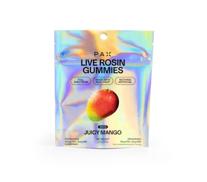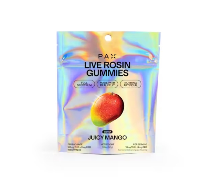 PAX Gummy in Juicy Mango flavor, a delightful treat designed for those who appreciate the finer things in life. Each gummy is infused with premium live rosin, delivering a potent and flavorful experience that elevates relaxation to new heights. With 100mg of THC in every package, this Indica variety is perfectly crafted to help you unwind and drift into a serene state of bliss. The Juicy Mango flavor bursts with tropical sweetness, reminiscent of sun-ripened fruit perched on a warm beach, providing an indulgent way to enjoy your favorite cannabinoid.