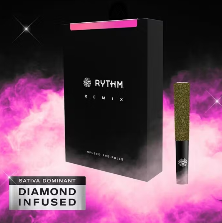 This vibrant sativa-dominant strain overflows with a juicy-as-it-gets flavor profile of sweet, creamy mango. Remix pre-rolls feature RYTHM premium indoor flower double infused with THCa diamonds and kief for maximum potency and fine-tuned with 100% natural terpenes.