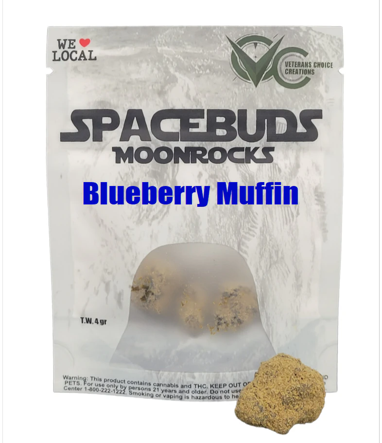 Embark on a delicious journey with SPACEBUDS Moonrocks - Blueberry Muffin! These moonrocks are drenched in rich Hash Rosin and infused with a proprietary terpene blend. Each nugget is then coated in kief, delivering a potent and flavorful experience reminiscent of freshly baked blueberry muffins. Enjoy the calming, euphoric, and uplifting effects that will transport you to a state of blissful relaxation. Discover the exceptional quality and innovation of Veterans Choice Creations in every puff.