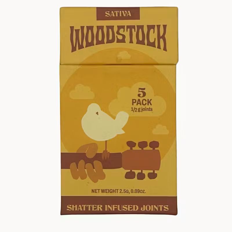 Old School meets new school in Woodstock new improved classic shatter infused pre-rolls. This easy rider of a five pack fits in any pocket and each joint is infused to take you on a magic carpet ride. The classic combination of picasso moon flower with SFV flower is a potent but pure sativa.